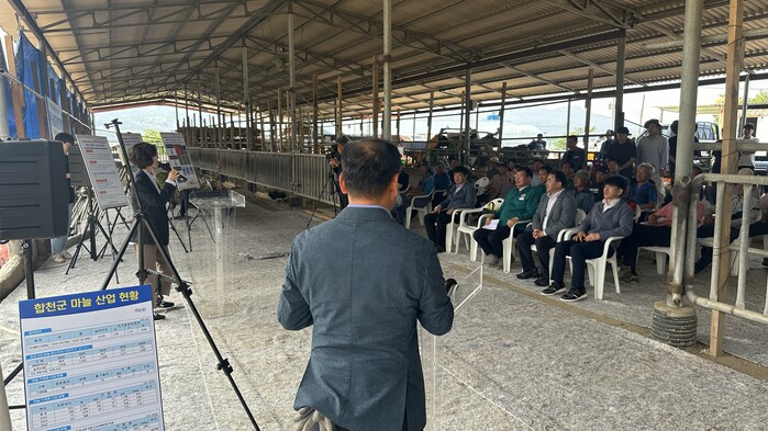 합천군의 마늘 기계화 추진 현황 보고와 마늘 전과정 기계 수확 작업 연시회 순으로 진행된 이날 행사에 선보인 농업기계는 마늘 종 절단기, 보행형 줄기 절단기, 굴취기(3종), 트랙터 부착형 마늘 수확기, 승용형 자주식 수집기(3종)로 관행 대비 노동력은 67%, 생산 비용은 47% 절감할 수 있다.
