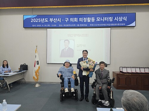 [부산=최성일 기자] 부산광역시의회 교육위원회 김창석 의원(국민의힘, 사상구2)은 지난 9월 30일 부산광역시의회 중회의실에서 열린 (사)부산장애인자립생활센터총연합회에서 주최하는“2025년도 부산시·구의회 의정활동 모니터링 시상식”에서 광역의회 부문 우수의원으로 선정됐다.