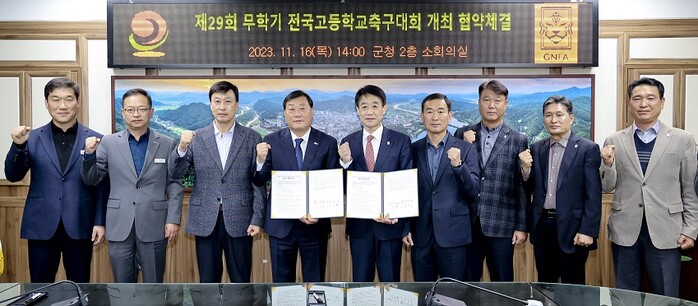 [합천=이영수 기자] 합천군(군수 김윤철)은 16일 군청 2층 소회의실에서 제29회 무학기 전국고등학교축구대회 개최를 위한 협약을 체결했다.