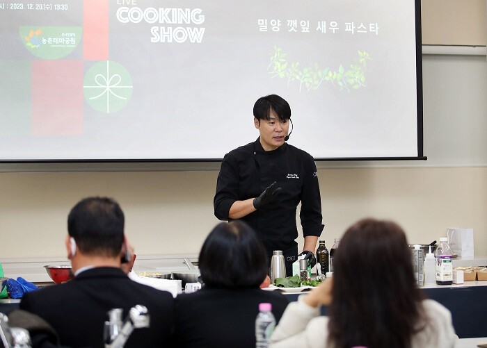 이날 쿠킹쇼는 국내 최정상급 셰프인 최현석 셰프를 초빙해 관람객과 소통하며 밀양고유의 지역특산물인 사과, 포도를 활용한 돼지고기 샐러드, 깻잎, 청량고추를 활용한 깻잎파스타 음식을 시연하는 쿠킹쇼를 개최해 관람객에게 쿠킹스튜디오를 비롯한 농촌테마공원의 시설을 알리는 시간이 됐다.