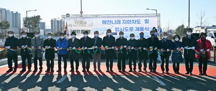 인천경제자유구역청이 최근 해찬나래 지하차도 상부에서 개통식을 개최했다. 이에따라 앞으로 영종하늘도시 주민들의 출퇴근길 교통 정체가 크게 해소될 것으로 보인다. 사진은 개통식에 참석한 참석 내외빈의 리본 커팅식 진행 모습.(사진제공=인천경제자유구역청)