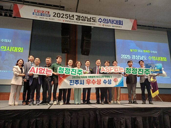 진주시가 지난 15일 창원컨벤션센터에서 개최된 ‘2025년 경상남도 수의사대회’에서 ‘가축방역 우수 기관상’을 수상했다. 진주시는 지난해 최우수 기관 선정에 이어 올해는 우수기관으로 선정되어 가축방역 분야에서 경남도내 최고 수준임을 증명했다.
