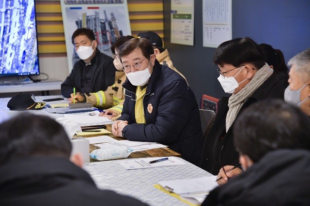[광주=정찬남 기자] 이용섭 광주광역시장이 9일 오전 지역재난안전대책본부에서 열린 현대산업개발 아파트 신축공사 붕괴사고 대책회의에 참석해 사고 피해복구 등 후속 대책을 논의하고 있다./광주광역시 제공