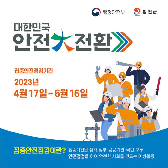 군 관계자는 “철저한 현장점검과 함께 재난 예방 활동을 통한 안전한 사회 실현 및 안전문화 확산으로 안전도시 합천군을 만들어가겠다”며 "이번 점검에 안전신문고 참여, 국민 참여형 안전문화 확산에 협조를 구한다"고 말했다.
