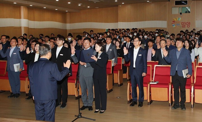 본청 전 직원, 직속기관 담당주사 이상, 읍면동장뿐만 아니라 지난 3월 정례조회부터 산하기관(시설관리공단, 문화관광재단, 밀양물산) 팀장급 이상 직원들도 함께 참석해 시정 전반에 대한 공유와 소통의 시간을 가졌다.