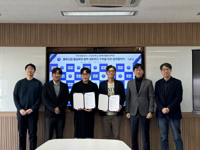 | 인천대 동북아물류대학원과 위밋모빌리티간 양해각서 체결행사 참가자들이 포즈를 취하고 있다. [사진=인천대] |