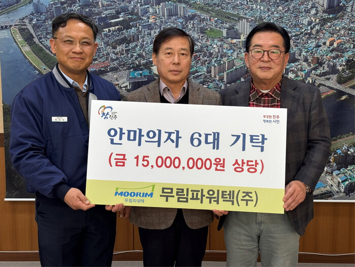 무림파워텍(주)(대표 이형수)는 5일 진주시복지재단(이사장 이성갑)에 안마의자 6대(환가액 1,500만여 원 상당)를 기탁했다.