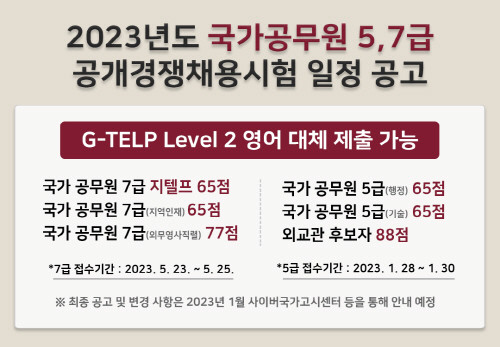 이에 지텔프(G-TELP) 시험에 응시하는 공시 수험생들이 크게 증가하고 있다. 국제공인 영어시험 지텔프는 5급, 7급 영어 과목 필기시험의 대체로 활용되고 있으며 5급, 7급 공무원 지원 시 레벨 2의 65점, 외무영사 직렬 77점, 외교관 후보자 88점 이상일 경우 제출이 가능하다. 지텔프는 타 영어 시험 대비 짧은 시험 시간(약 90분), 적은 문항 수(80문항), 빠른 성적 발표(5일 이내) 등의 이점으로 공시생, 취업 준비생들에게 인기를 끌고 있다.
