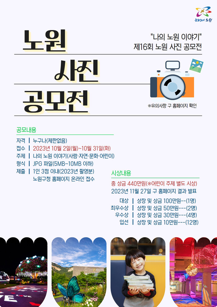 [시민일보 = 홍덕표 기자] 서울 노원구(구청장 오승록)는 '나의 노원 이야기'라는 주제로 '노원 사진 공모전'을 개최한다고 13일 밝혔다.