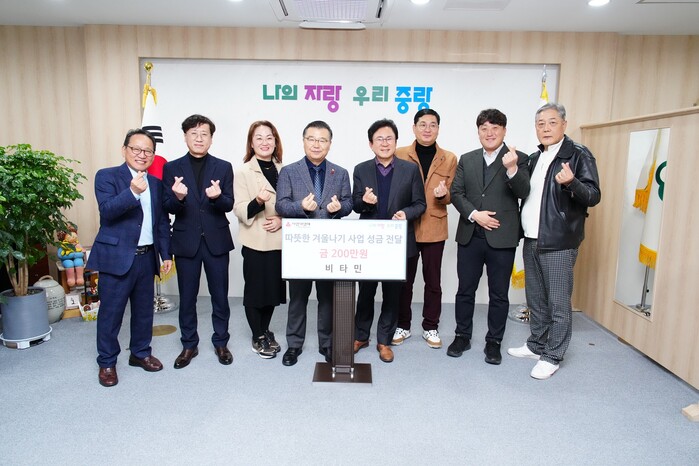 서울 중랑구는 지난 14일 비타민골프회로부터 성금 200만원, 중랑구시설관리공단 및 중랑구배드민턴협회로부터 성금 약 550만원을 전달받았으며, 서울시립대학교로부터 김치 10kg 230상자와 백미 3kg 230포의 성품도 전달받았다. 성금·품을 서울사회복지공동모금회에 기탁하고 기부자들의 뜻에 따라 지역내 저소득 가구에 지원할 예정이다. 사진은 이날 류경기 구청장(왼쪽 네번째)과 비타민골프회가 기념촬영을 하고 있는 모습.(사진=중랑구청 제공)