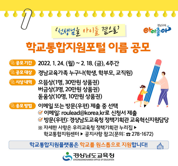 경상남도교육청(교육감 박종훈)이 학교를 통합 지원하기 위해 구축·운영 예정인 「학교통합지원포털」 이름을 1월 24일부터 2월 18일까지 4주간 경남교육가족(학생, 학부모, 교직원)을 대상으로 공모한다.