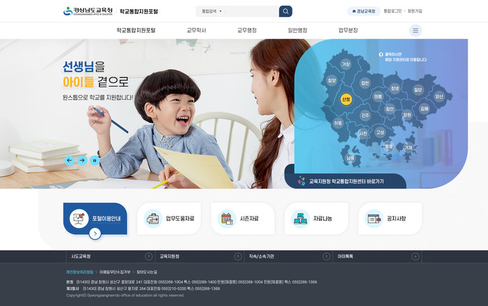 「학교통합지원포털」은 ‘선생님을 아이들 곁으로’라는 가치 실현을 위해 기존 별도 운영하던 학교업무도움자료방과 학교통합지원센터 특성화 누리집을 통합하고, 사용자의 접근성과 편의성을 높이는 것은 물론 통합적 자료 제공과 사용자 간 자료 나눔으로 통합 학교 지원이 가능하게 한 전용 사이트이다.