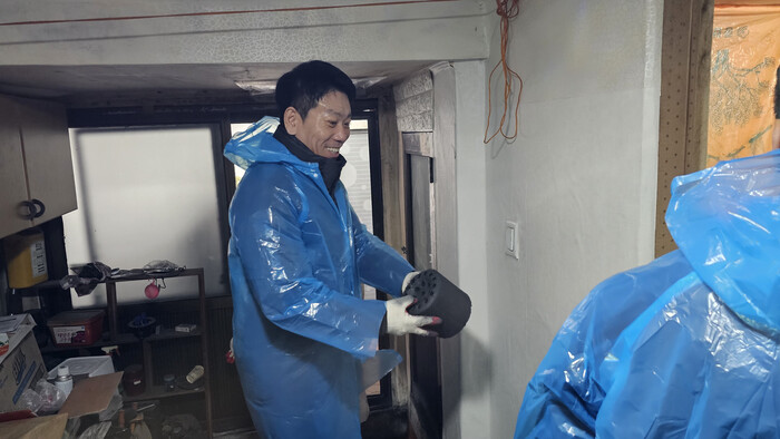 | ▲ 인큐텐 박진희 의장이 회원들과 함께 연탄 나눔을 하고 있다. |