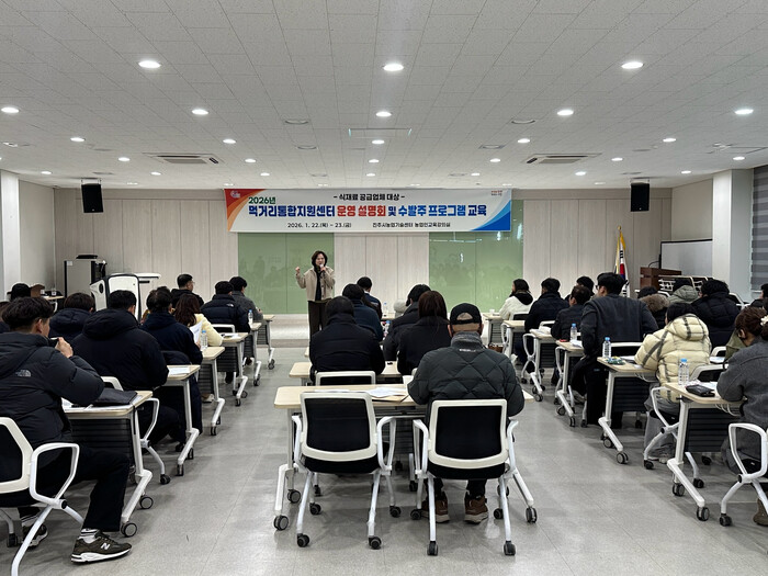 진주시는 22일 농업기술센터에서 ‘2026년 먹거리통합지원센터 식재료 공급업체 운영 설명회’를 가졌다.