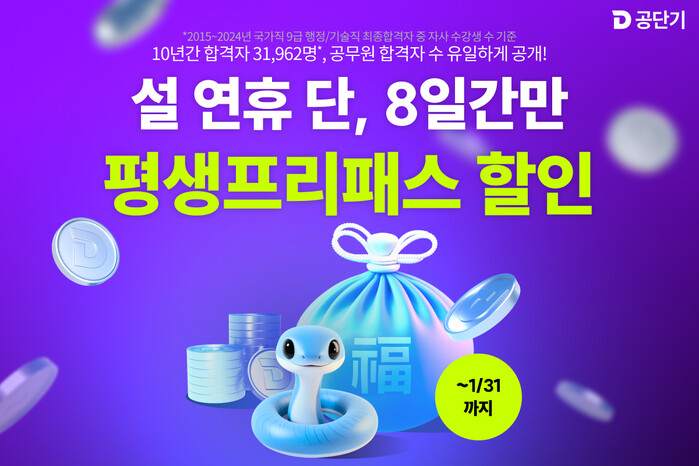 설날 연휴에도 학업에 전념하는 공시생을 응원하기 위해 마련된 이번 이벤트는 모든 프리패스를 대상으로 할인 혜택을 제공한다. 특히, 합격할 때까지 무제한으로 수강할 수 있는 ‘평생 프리패스’ 상품은 이번 겨울 시즌에만 특별 재판매 될 예정이다.