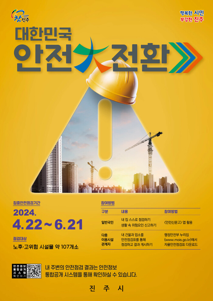 진주시는 4월 22일부터 6월 21일까지 총 61일간 관내 107개소 시설물에 대해 ‘대한민국 안전대전환, 2024 집중안전점검’을 실시한다.