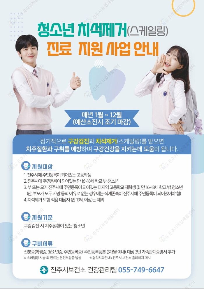 진주시는 치주관리가 필요한 청소년을 대상으로 ‘청소년 치석제거 진료비 지원사업’을 시행하고 있다.