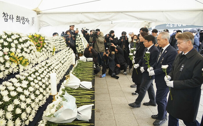 | ▲ 강기정 광주광역시장(오른 쪽부터 세 번째)이 30일 오후 동구 5·18민주광장에 마련된 ‘제주항공 여객기 참사 희생자 합동분향소’를 찾아 광주지역 국회의원, 이정선 광주시 교육감 등과 헌화하고 있다./광주광역시 제공 |