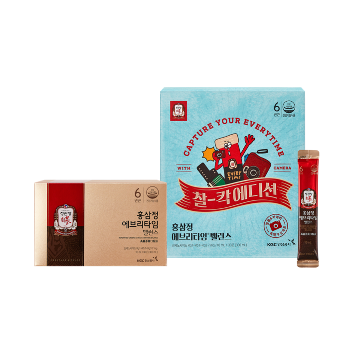 ‘홍삼정 에브리타임밸런스 찰칵에디션’은 에브리타임밸런스(10ml*30포)에 필름카메라, DIY 스티커 등으로 구성된 한정판 제품이다. ‘에브리타임밸런스’는 6년근 홍삼농축액에 감초추출물, 프로폴리스 등의 부원료로 풍미를 더해 홍삼 입문자도 부담 없이 즐길 수 있는 것이 특징이다.