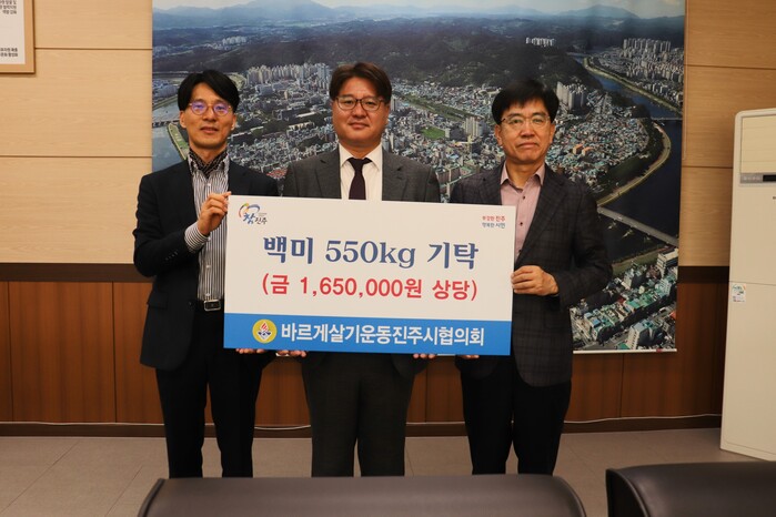 바르게살기운동 진주시협의회(회장 안현수)는 26일 진주시복지재단(이사장 이성갑)을 찾아 지역 내 어려운 이웃을 위해 사용해 달라며 회장 취임 기념 백미 550kg(환가액 165만 원 상당)를 기탁했다.