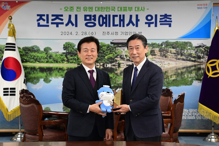 진주시는 28일 시청 기업인의 방에서 오준 전 유엔대사를 ‘진주시 명예대사’로 위촉했다.