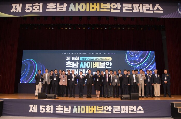 [광주=정찬남 기자] 고광완 광주광역시 행정부시장이 2일 오후 김대중컨벤션센터에서 열린 제5회 호남 사이버보안 콘퍼런스에 참석해 참석자들과 함께 기념촬영을 하고 있다. /광주광역시 제공