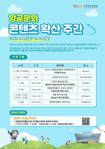 7월 1일에는 ‘항공우주기술의 파괴적 혁신과 미래전망’ 특별 컬로퀴엄(서울대학교 김승조 명예교수)을 진행한다. 2일 ‘강서구 다문화가정 어린이 초청’ 사회공헌 프로그램도 시행한다. 10일까지 국립항공박물관 블로그, 페이스북, 인스타그램에서 ‘항공박물관 추억사진 공유 이벤트’도 전개한다.
