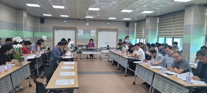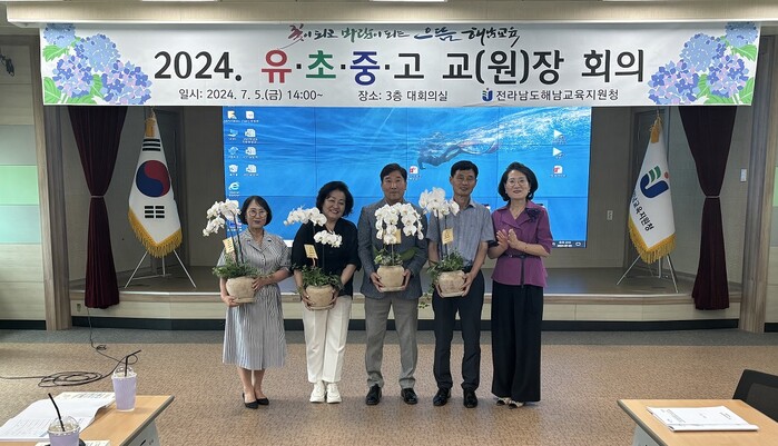 이날 회의는 다음달 8월 31일자로 정년퇴임을 하게 된 초·중등 교장 4명에 대한 꽃다발 증정 및 축하 인사를 시작으로 이달(7월) 1일자 전입 직원 소개, 2024학년도 여름방학중 주요 업무 안내 순으로 진행됐다.