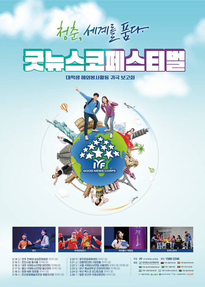 ‘청춘, 세계를 품다’라는 슬로건 아래 열리는 굿뉴스코 페스티벌은 지난 1년 동안 해외 봉사활동을 마치고 돌아온 국내 대학생들의 생생한 활동 보고서다. 대학생들이 직접 기획하고 참여하는 국내 유일의 해외봉사 귀국 콘서트로, 해외에서 경험한 도전과 성장을 음악과 공연으로 전달한다.