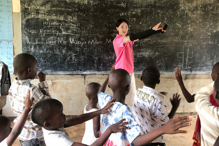 | ▲ 우간다 강민희 단원이 학생들에게 율동을 가르치고 있다. Ⓒ IYF |