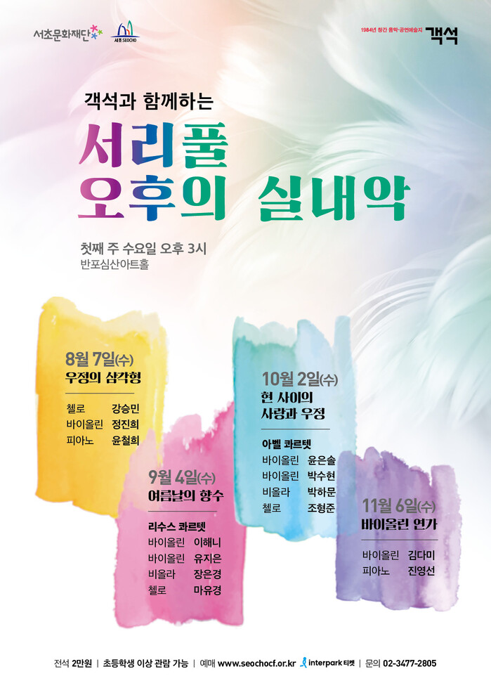 ‘객석’과 함께하는 <서리풀 오후의 실내악>은 반포심산아트홀에서 트렌디한 연주자들을 8월부터 11월까지 총 4회에 걸쳐 매월 첫째 주 수요일 오후 세 시에 만날 수 있는 프로그램이다.