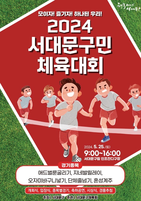 [시민일보 = 변은선 기자] 서울 서대문구(구청장 이성헌)는 ‘모이자! 즐기자! 하나 된 우리!’란 캐치프레이즈 아래 오는 25일 오전 9시~오후 4시 서대문구립인조잔디구장에서 ‘2024년 서대문구민체육대회’를 개최한다.