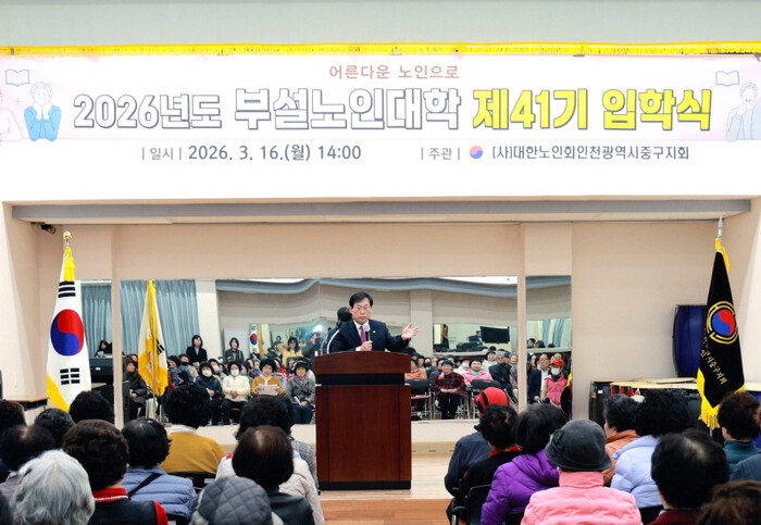 | 이종호 의장이 대한노인회 인천시지회 부설노인대학 제41기 입학식에 참석, 축사를 하고 있다. [사진=중구의회] |