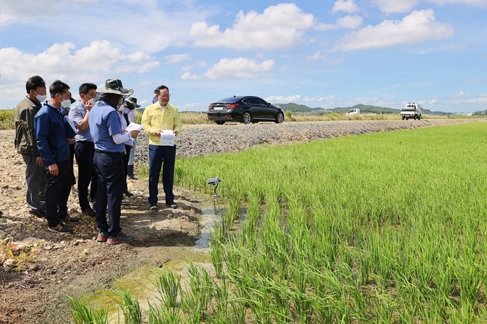 | ▲ 명현관 해남군수가 6일 가뭄과 폭염으로 피해가 우려되는 관내 벼 재배 현장을 방문해 배 생육상황을 점검하고 있다. / 사진=해남군 제공 |