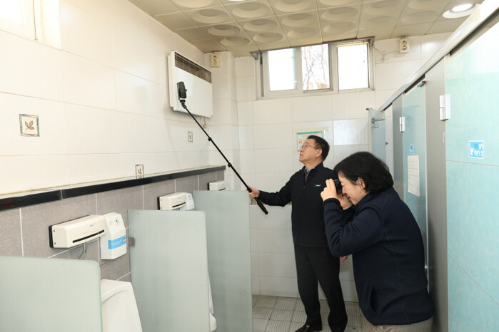 | 김성훈 이사장(가운데)이 본부 내 시설물에 대해 불법 촬영기기 탐지 점검을 진행하고 있다. [사진=인천환경공단] |