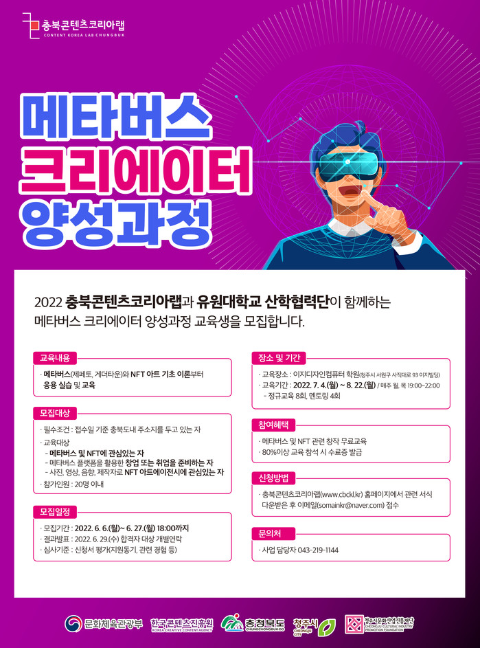 청주시가 주관하고 청주시문화산업진흥재단(대표이사 박상언)이 운영하는 충북콘텐츠코리아랩이 오는 27일(월)까지 ‘메타버스 크리에이터 양성과정’교육생을 모집한다고 밝혔다.