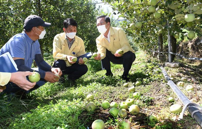 구 군수는 사과 낙과피해를 입은 웅양면, 고제면 농가와 위천면 벼 도복 농가를 방문하여 현장을 점검하고 피해 상황에 대해 이야기를 나누고 농업인을 위로했다.