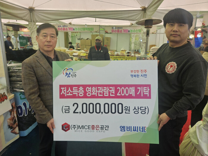 진주시복지재단(이사장 이성갑)은 ㈜마이스 좋은 공간(대표 위영수)에서 지역 내 어려운 이웃을 돕기 위한 롯데시네마 엠비씨네점 무료 영화관람권 200매(환가액 200만 원 상당)를 기탁했다고 20일 밝혔다.