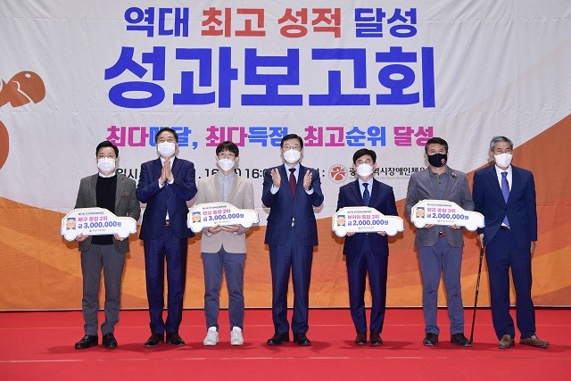 [광주=정찬남 기자] 이용섭 광주광역시장(가운데)이 16일 오후 서구 장애인국민체육센터 체육관에서 열린 '제41회 전국장애인체육대회 광주선수단 성과보고회'에 참석해 우수한 성적을 거둔 선수단에 포상을 한 뒤 기념촬영을 하고 있다./광주광역시 제공