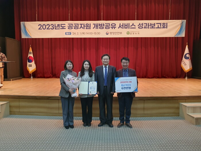 충남 아산시는 지난 1일 행정안전부 주관 ‘2023 공공자원 개방·공유서비스 지방자치단체 실적평가’에서 최우수기관으로 선정돼 특별교부세 6000만원을 확보했다. 시는 이번 평가에서 주민활용도가 높은 공공자원 194건 발굴 제공 등이 시민 편의를 대폭 확대했다는 평가를 받았다. 사진은 수상식에서 관계자들이 기념촬영을 하고 있는 모습.(사진=아산시청 제공)