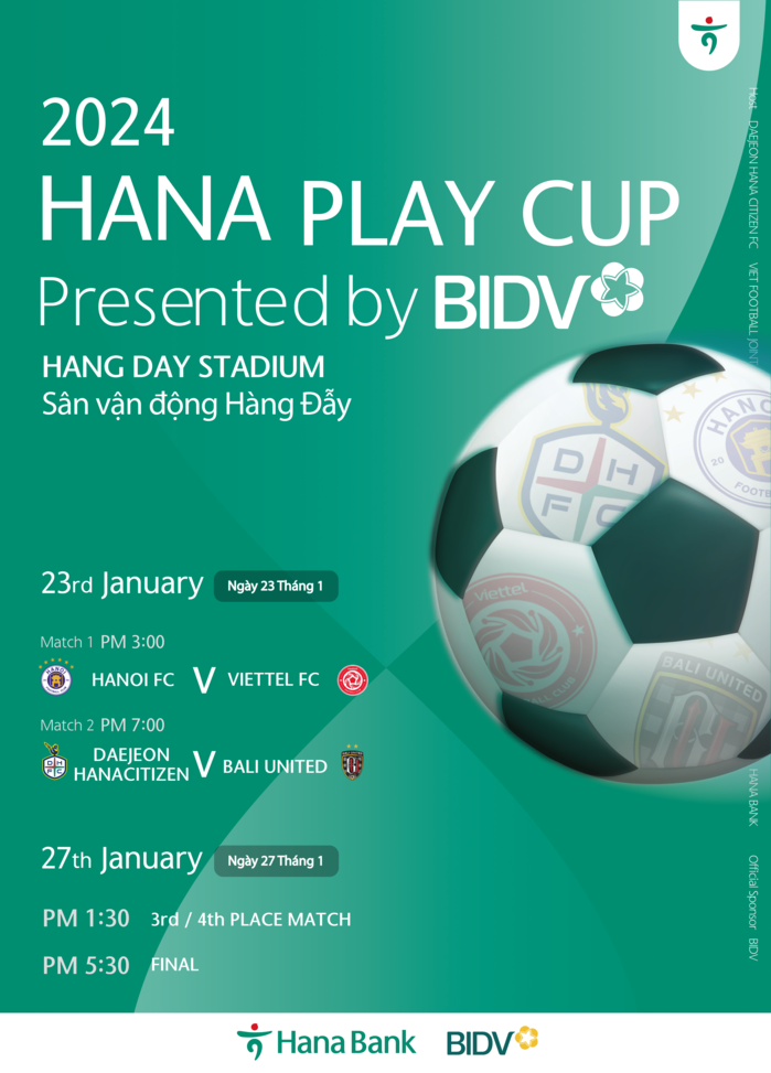 오는 23일부터 27일까지 총 5일간 베트남 하노이 항더이 경기장에서 진행되는 'BIDV 초청 하나플레이컵'에는 K리그1 '대전하나시티즌'과 V리그1을 대표하는 '하노이FC', '비엣텔FC'를 비롯해 인도네시아 프로축구팀 '발리유나이티드FC'가 참가하며, 토너먼트 방식으로 팀당 2경기씩 치러진다.