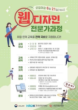 웹디자인 전문가 과정에 대한 자세한 사항은 (재)부산디자인진흥원 홈페이지 고시/공고를 통해 확인할 수 있으며, 교육과 관련한 기타 문의사항은 (재)부산디자인진흥원 사회서비스디자인팀으로 하면 된다.