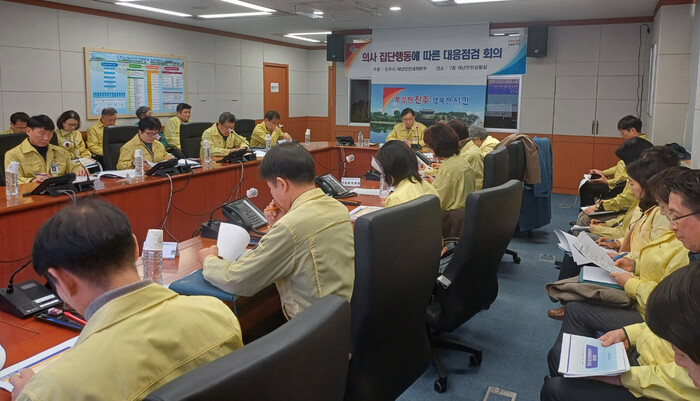 진주시 재난안전대책본부 총괄조정관 주재로 열린 이날 회의에서는 의사 집단행동 상황과 진주시 관내 의료계 동향을 점검하고 향후 대응 방안이 논의됐다.