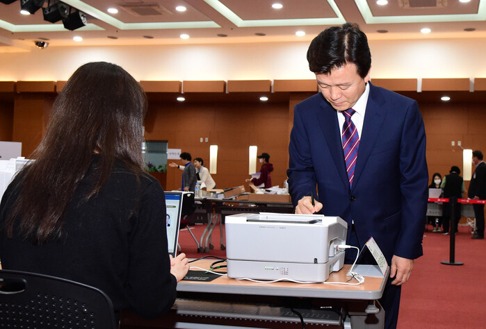 조규일 진주시장은 5일 제22대 국회의원선거 사전투표 첫날을 맞아 시청 시민홀에 설치된 상대동 사전투표소에서 소중한 한 표를 행사하며 투표 참여를 홍보했다.