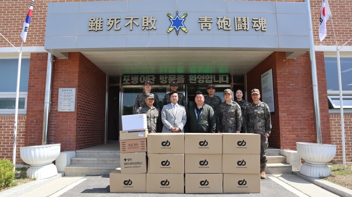 | ▲ 재단법인 화이트타이거즈와 방역용품업체 담원에서 지난 3일 청성부대 포병여단을 방문해 방역용품 화장품 등을 전달 했다. |