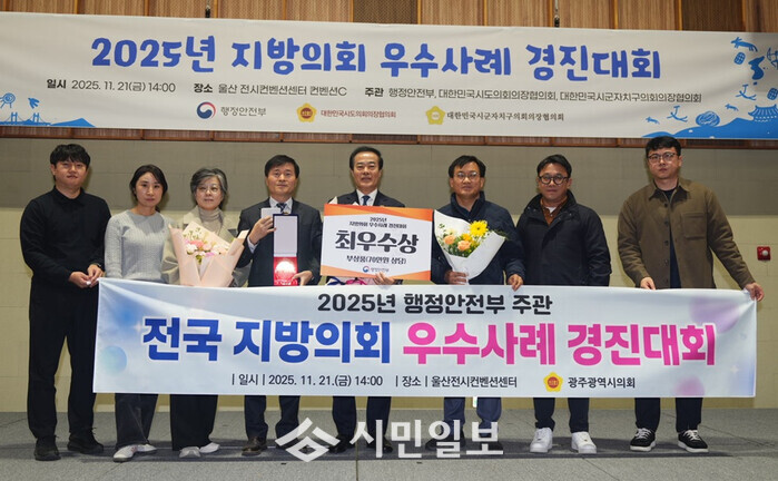 | ▲ 광주광역시의회, 21일 울산전시컨벤션센터에서 열린 행정안전부 주관 ‘2025년 지방의회 우수사례 경진대회’ 에서 ‘최우수상’ 수상 기념촬영 / 광주광역시의회 제공 |