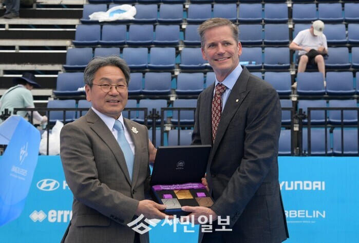 | ▲ 강기정 광주광역시장(왼 쪽)이 12일 5·18민주광장 특설경기장에서 그레그 이스턴 세계양궁연맹(WA) 신임 회장으로부터 대회 성공 개최 감사의 선물을 전달받고 있다. /광주광역시 제공 |