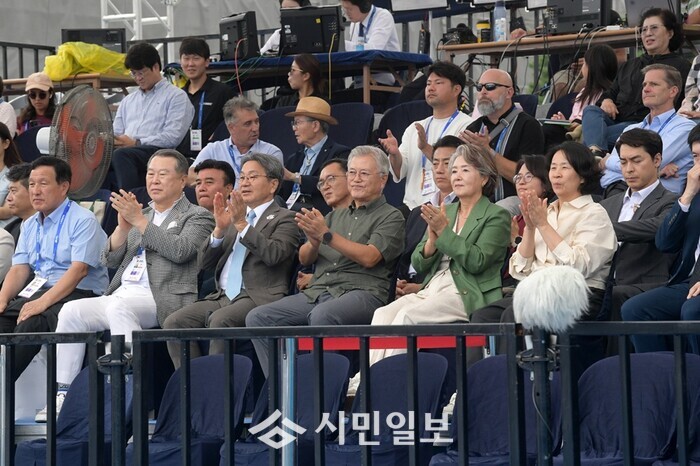 | ▲ 강기정 광주광역시장이 12일 문재인 전 대통령, 김정숙 여사와 함께 5·18민주광장 특설경기장에서 열린 '광주 2025 현대세계양궁선수권대회' 리커브 여자 개인전을 관람하고 있다./광주광역시 제공 |