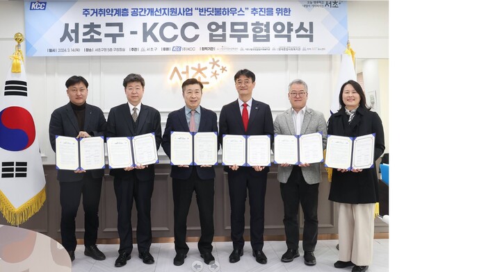 서초구청에서 열린 이날 협약식에는 KCC 김상준 상무, 서초구 전성수 구청장을 비롯해 4개 복지기관 관계자들이 참석해 2024년도 사업 추진을 위한 업무협약 체결과 2023년 사업 성과를 공유했다.