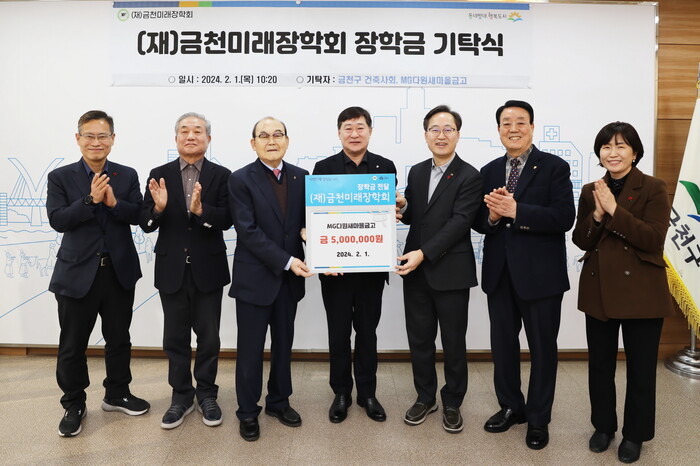 서울 금천구에 설 명절을 앞두고 연이은 기부 행렬이 이어져, 지난 1일 MG다원새마을금고로부터 500만원, 금천구 건축사회으로부터 250만원을 재단법인 금천미래장학회에 기탁받았다. 사진은 이날 유성훈 구청장(오른쪽 세번째)과 MG다원새마을금고 관계자들이 기념촬영을 하고 있는 모습.(사진=금천구청 제공)